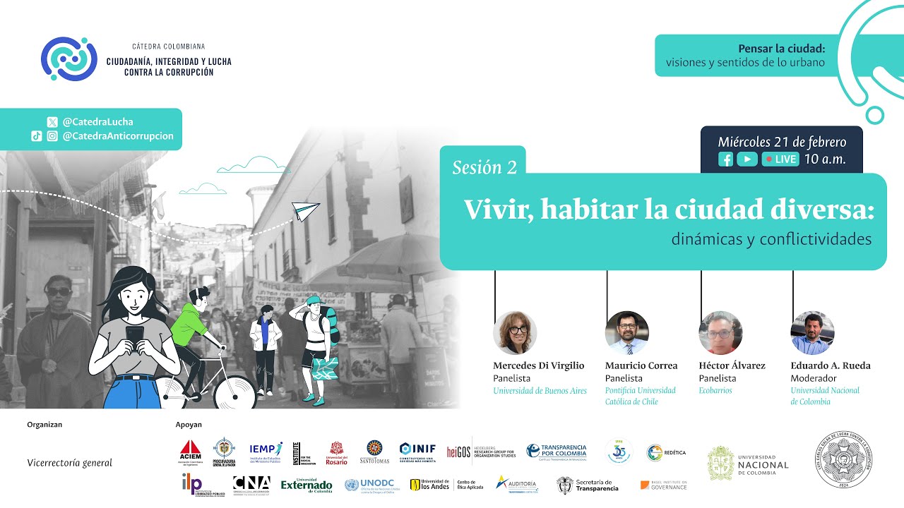 Bienvenid@ a la Sesión 2 de la Séptima Versión Cátedra Colombiana Ciudadanía, Integridad y Lucha contra la Corrupción: "Pensar la ciudad: visiones y sentidos de lo urbano." de la unidad temática 1. Eduardo A. Rueda (Director de la catedra, Universidad Nacional de Colombia) Mercedes Di Virgilio (Universidad de Buenos Aires) Mauricio Correa (Pontificia Universidad Católica de Chile) Héctor Álvarez (Ecobarrios) ¡Gracias por acompañarnos una vez más! Síguenos en nuestras redes y página web: FB: http://www.facebook.com/CatedraAnticorrupcion IG: http://www.instagram.com/catedraanticorrupcion PW: http://catedra-anticorrupcion.unal.edu.co TW: http://twitter.com/catedralucha YT: https://www.youtube.com/@catedraanticorrupcionunal