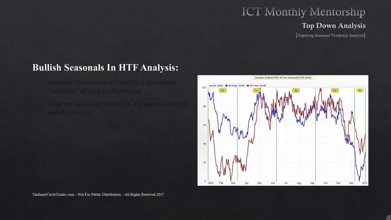 In this lesson, we will be teaching how to apply seasonal tendencies to higher time frame analysis, specifically focusing on bullish seasonals in higher time frame analysis using the Canadian dollar.