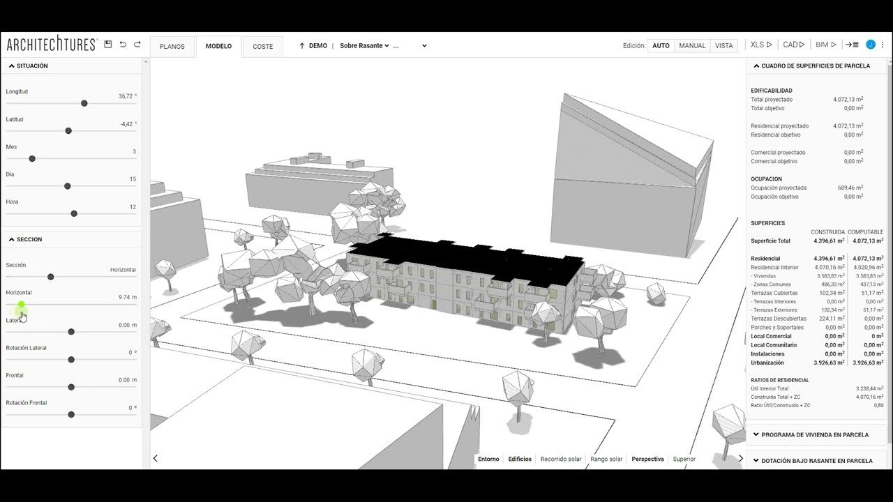 • Various visualization tools are available: environment display toggle, existing building visibility control, solar path display toggle, solar projection activation/deactivation, default perspective view, and overhead view.