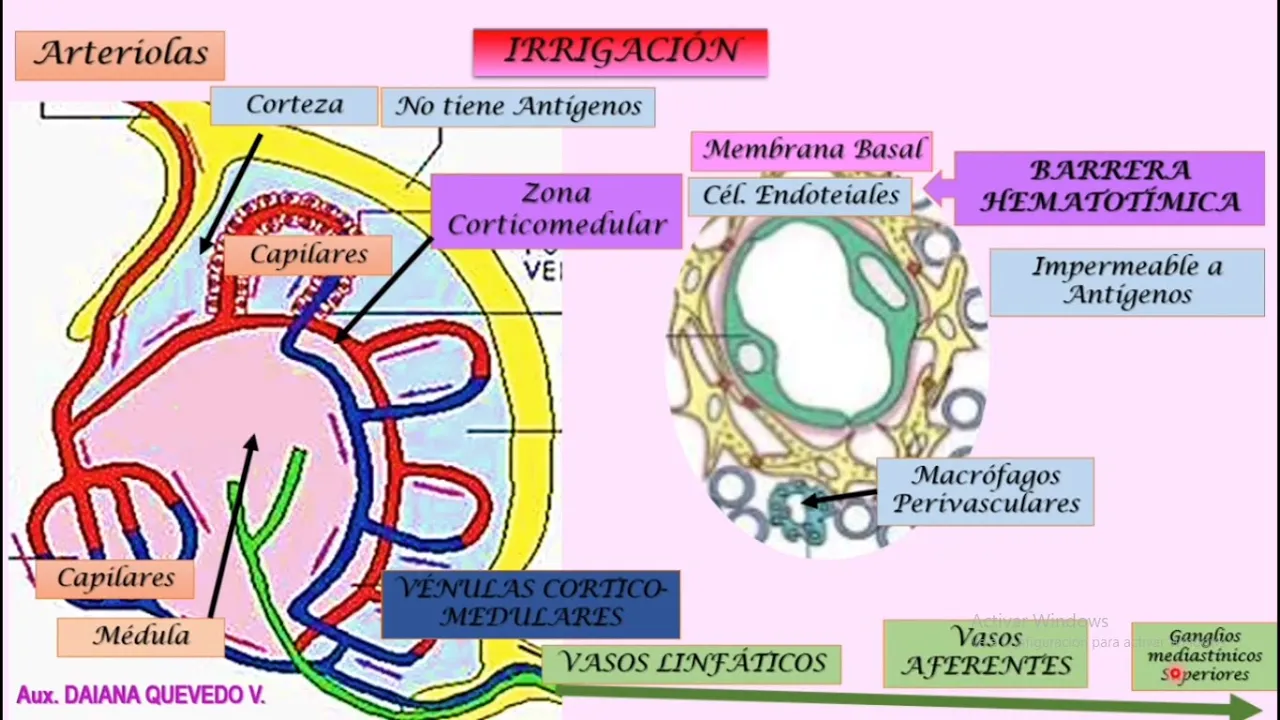 - Blood supply to the thymus involves arteries entering through septa from which capillaries branch out to irrigate both cortex and medulla. These capillaries form a barrier preventing large molecules and antigens from passing through.