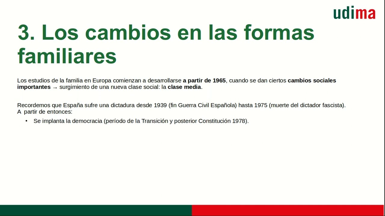 This section discusses the changes in family structures in Europe, particularly focusing on Spain's delayed development due to historical factors like dictatorship.