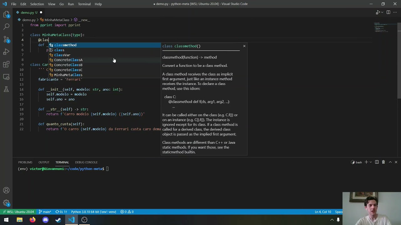 - A discussion on metaclasses begins, explaining their role in altering how classes are created and represented in memory.