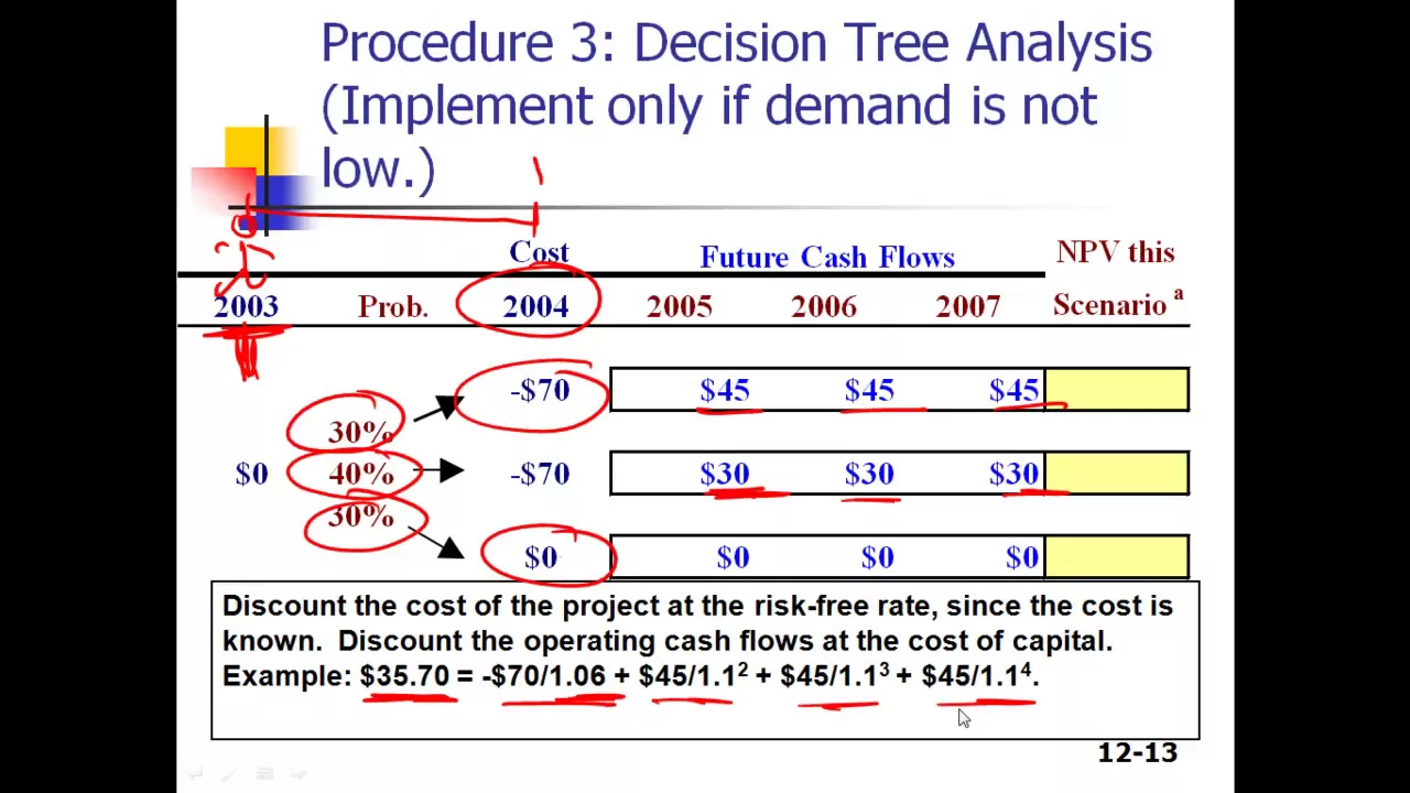 - The project is labeled risky due to uncertain demand; if demand falls short, it could lead to significant losses reflected in negative NPVs (e.g., a 30% chance of losing 32 million). This highlights how risk assessment plays into financial decision-making.