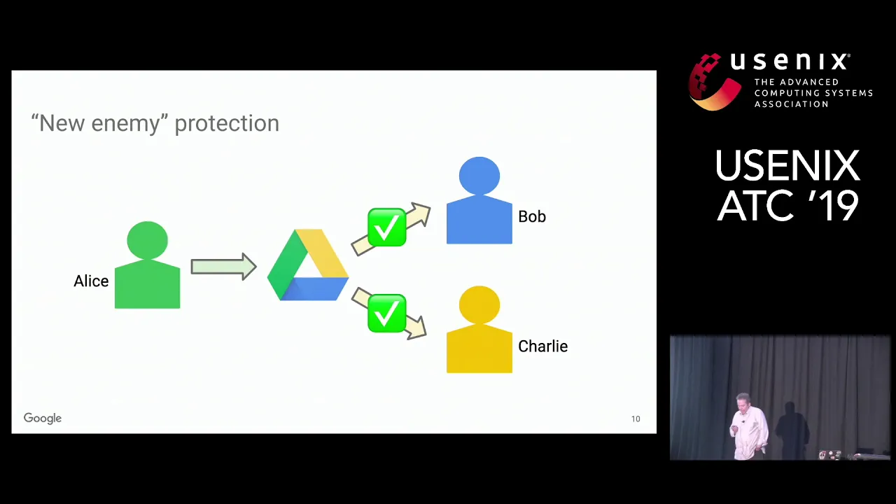 Ramon Caceres, Ruoming Pang, Mike Burrows, Zhifeng Chen, Pratik Dave, Nathan Germer, Alexander Golynski, Kevin Graney, and Nina Kang, Google; Lea Kissner, Humu, Inc.; Jeffrey L. Korn, Google; Abhishek Parmar, Carbon, Inc.; Christopher D. Richards and Mengzhi Wang, Google Determining whether online users are authorized to access digital objects is central to preserving privacy. This paper presents the design, implementation, and deployment of Zanzibar, a global system for storing and evaluating access control lists. Zanzibar provides a uniform data model and configuration language for expressing a wide range of access control policies from hundreds of client services at Google, including Calendar, Cloud, Drive, Maps, Photos, and YouTube. Its authorization decisions respect causal ordering of user actions and thus provide external consistency amid changes to access control lists and object contents. Zanzibar scales to trillions of access control lists and millions of authorization requests per second to support services used by billions of people. It has maintained 95th-percentile latency of less than 10 milliseconds and availability of greater than 99.999% over 3 years of production use. View the full USENIX ATC '19 program at https://www.usenix.org/conference/atc19/technical-sessions