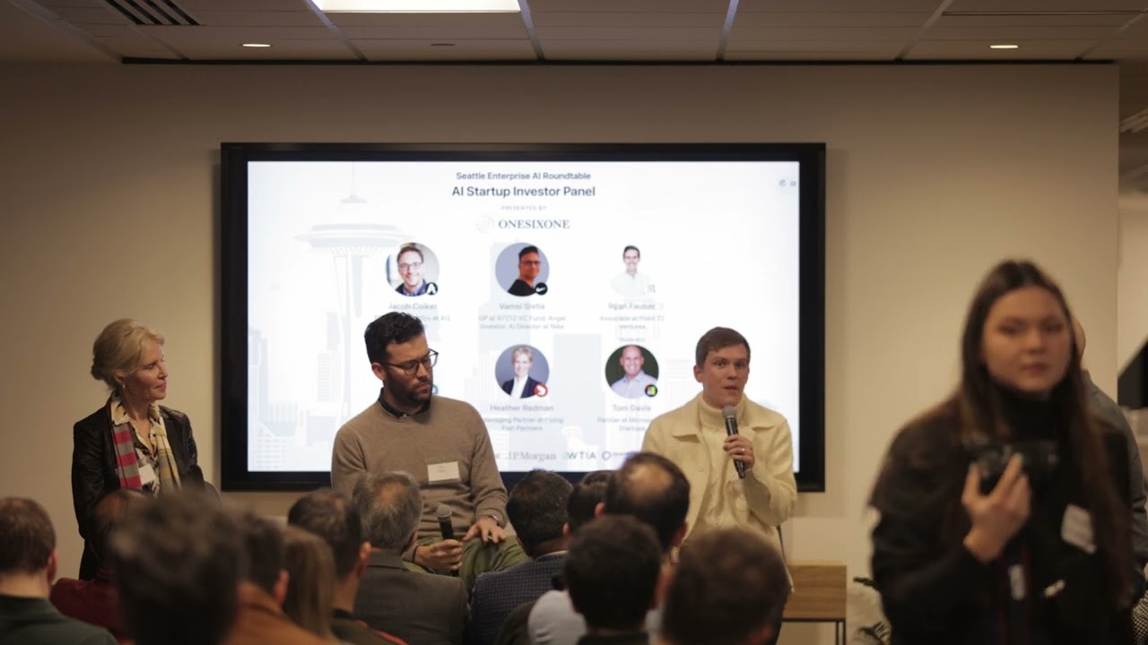 - Chris Picardo introduces himself as a partner at Madrona Venture Group, noting his short journey from upstairs to the panel.