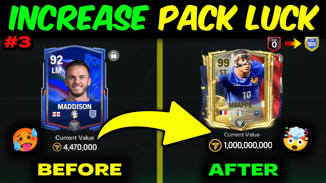 INCREASE PACK LUCK - REVEALING BIGGEST MYSTERY in FC Mobile | 0-105 OVR Series [Ep03] Check our website: https://mrbelieverhub.com Team OVR Calculator Tool: https://mrbelieverhub.com/ovr-calculation/ -------------------------------------------------------------------------- ✅ About This Video: -------------------------------------------------------------------------- 🔥Hello Believers, this is the episode 3 of the 0 to 105 OVR as F2P Series and in this episode we are going to unlock the biggest mystery about pack luck in fc mobile. I have shown total 1 week pack grinds from where you will reach to the conclusion on how actually pack luck works in fc mobile. I hope you will love this episode. Check all episodes of this series: (0 to 105 OVR as F2P Series) https://www.youtube.com/watch?v=mZVPz10IJkY&list=PL9vlpc1wQRjBSK8fx6JnHlKS7kxZInFZf 0 to 100 OVR as F2P Series Playlist [Check all episodes]: https://youtube.com/playlist?list=PL9vlpc1wQRjBSOzquHjL6xoQnqTyHv6aT&si=esEuPMPDr-XXkJKv Check How we can snipe players and get 30 to 50M coins per mascherano: https://youtu.be/oaxZxN-iLrg Join Me Here: -------------------------------------------------------------------------- Discord: https://discord.com/invite/mrbeliever IG: https://www.instagram.com/mrbeliever1810/ X: https://twitter.com/Mr_Believer1810?t=N1XpzStFBVwuMMqqWa_W_g&s=09 TikTok: https://tiktok.com/@mrbeliever1810 -------------------------------------------------------------------------- More Useful Videos and Contents: -------------------------------------------------------------------------- Gems trick Video: https://youtu.be/UbzioYgkKKM?si=v_UjG1L-U4K75TBV Buy or sell 999+ players: https://youtu.be/MvMTpcv4QHI?si=muPcwrCs9vGRBw8L How to sell Untradable Players or Mascherano in FC Mobile: https://youtu.be/vA_W-1RTWN0?si=o95cTZ4ktt2epw2m -------------------------------------------------------------------------- -------------------------------------------------------------------------- ✅ USEFUL PLAYLIST -------------------------------------------------------------------------- 🔥 All FC Mobile Tutorials: https://www.youtube.com/watch?v=KU7AEKSVPpU&list=PL9vlpc1wQRjCowC1h_Vq4wxAxZ83qgIOz&pp=gAQBiAQB -------------------------------------------------------------------------- 🔥 All FC Mobile Event Guides: -------------------------------------------------------------------------- https://www.youtube.com/watch?v=z2LzmndJg6I&list=PL9vlpc1wQRjA8nDOu78P65SToSay0s-j0&pp=gAQBiAQB -------------------------------------------------------------------------- ✅ Credits: -------------------------------------------------------------------------- Music: Song: 1. https://youtu.be/AEVaK0e1kTE?si=6DolpsSmxsr2eC7y 2. https://youtu.be/iHA1utIzpws?si=oXZKldMMaoQ_6hX5 3. https://youtu.be/CLEWmT_8ppM?si=7slRDCIlAFyuz6Dv 4. https://youtu.be/dXYFK-jEr8Y?si=eZZrS1h8-T-6fTtU Please let me know if I forgot anyone to give credit. Business inquiry email: amvksrtlm1810@gmail.com Thanks! #eafc24 #eafc #eafcmobile #fcmobile #viral